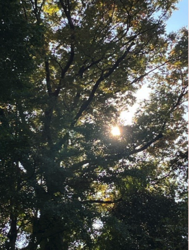 The photo is from one of those walks a few days ago, when the komorebi was just beautiful. “Komorebi” is one of those hard-to-translate Japanese words that describes the dappled light that shines through the leaves and branches of trees (ko = tree, more = shine through/leak, bi = sun).